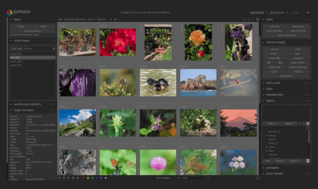 - Module «âŻLighttableâŻÂ» pour gĂ©rer lâimportation, le tri, le marquage dâimages, et «âŻDarkroomâŻÂ» pour lâĂ©dition.